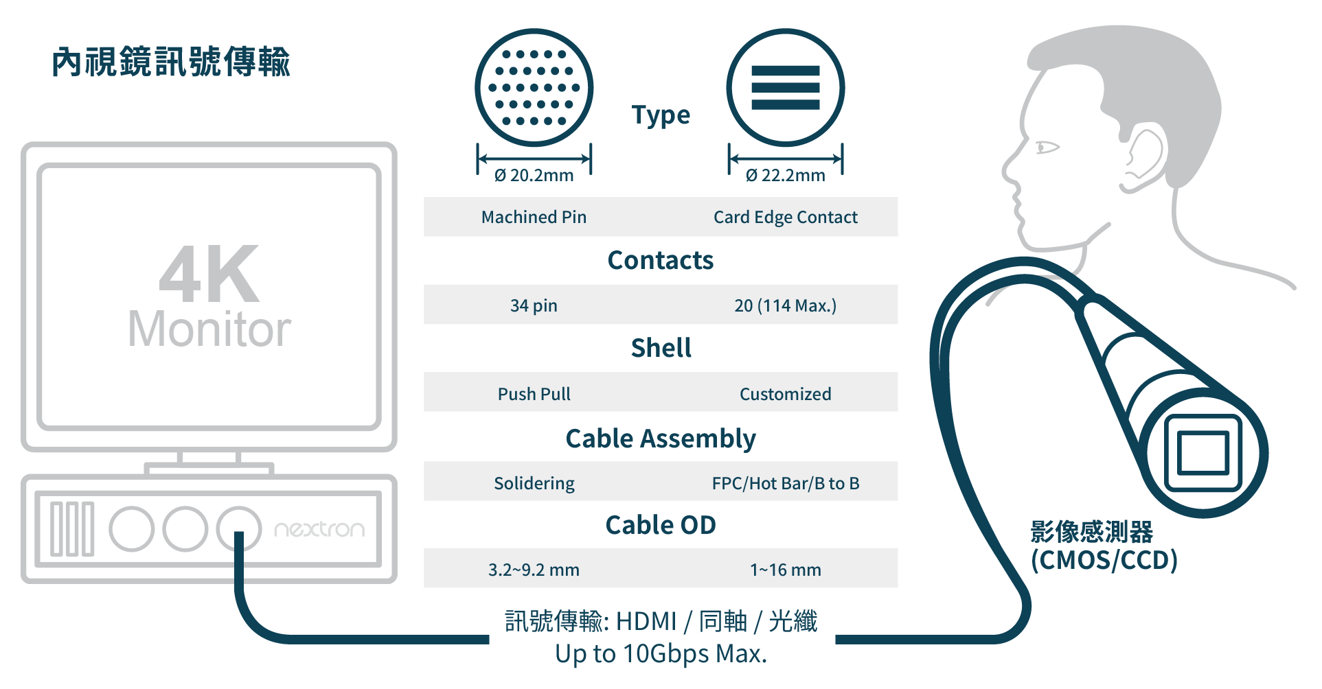內視鏡影像表現的關鍵,在於其與周邊設備之間是否能建立快速且穩定的連接。為此,Nextron 開發的內視鏡連接器系列支援高達 10Gb/s 的資料傳輸速度,確保影像能即時、精準地回傳。同時,透過獨特的連接設計,實現高密度接點配置,有效縮小連接器體積,降低對侵入性手術的干擾。此外,這類新一代拋棄式內視鏡連接方案還能因應不同手術需求,靈活加入額外功能,例如 IP68 等級防水能力、輸液通道等附加模組,提升整體應用價值。