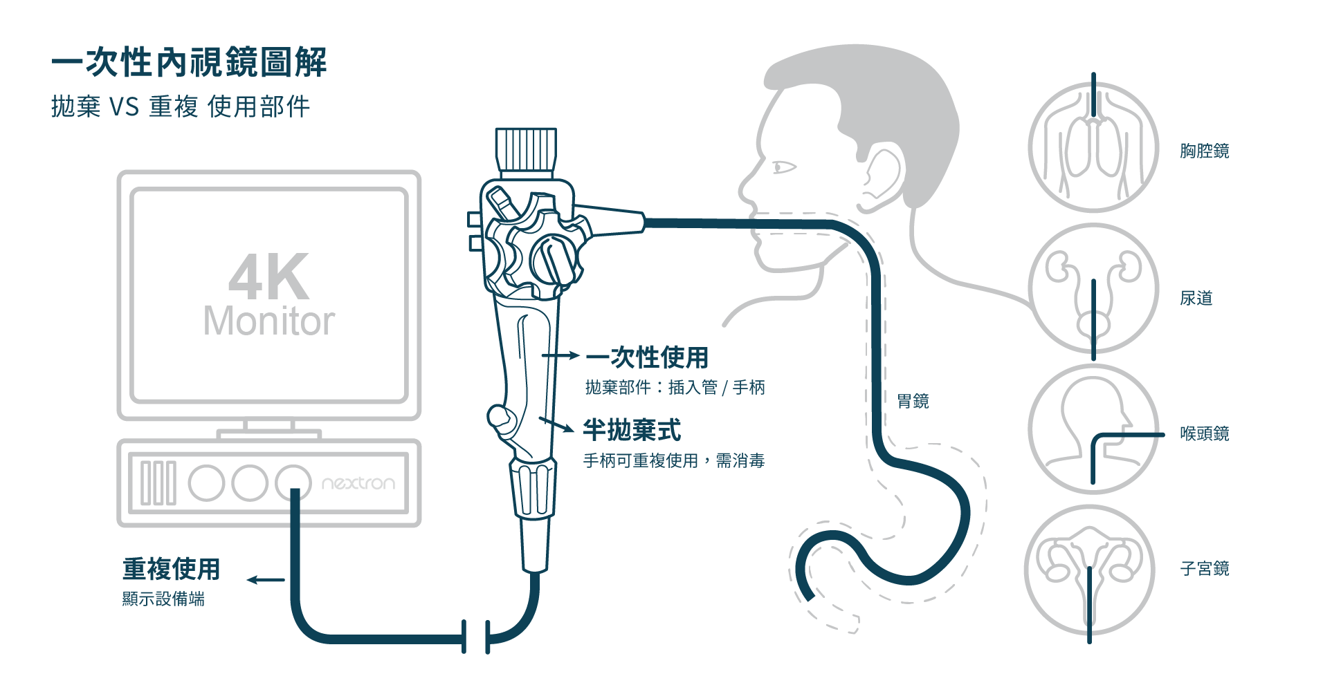 在日常高頻率的診斷性檢查中,如胃鏡、支氣管鏡與鼻咽喉鏡等,醫療機構特別重視效率與感染控制。一次性內視鏡的設計邏輯,正是針對傳統內視鏡中「感染風險高、清潔困難」的部位,如插入管、感測器與光學模組等直接接觸病人的部分,改為拋棄式使用。僅保留外部連接模組,既可降低感染風險,也可避免重複消毒的高成本與流程負擔。這樣的設計能兼顧成本控制與臨床效率,並在感染防護上提供更穩妥的解決方案。